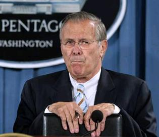 Rice courted the news media, racing through five television interviews in 17 minutes. Rumsfeld gave no separate interviews. At one point, he arrived early for a meeting and saw an array of television cameras inside the room. He shook his head at the reporters and turned on his heel.